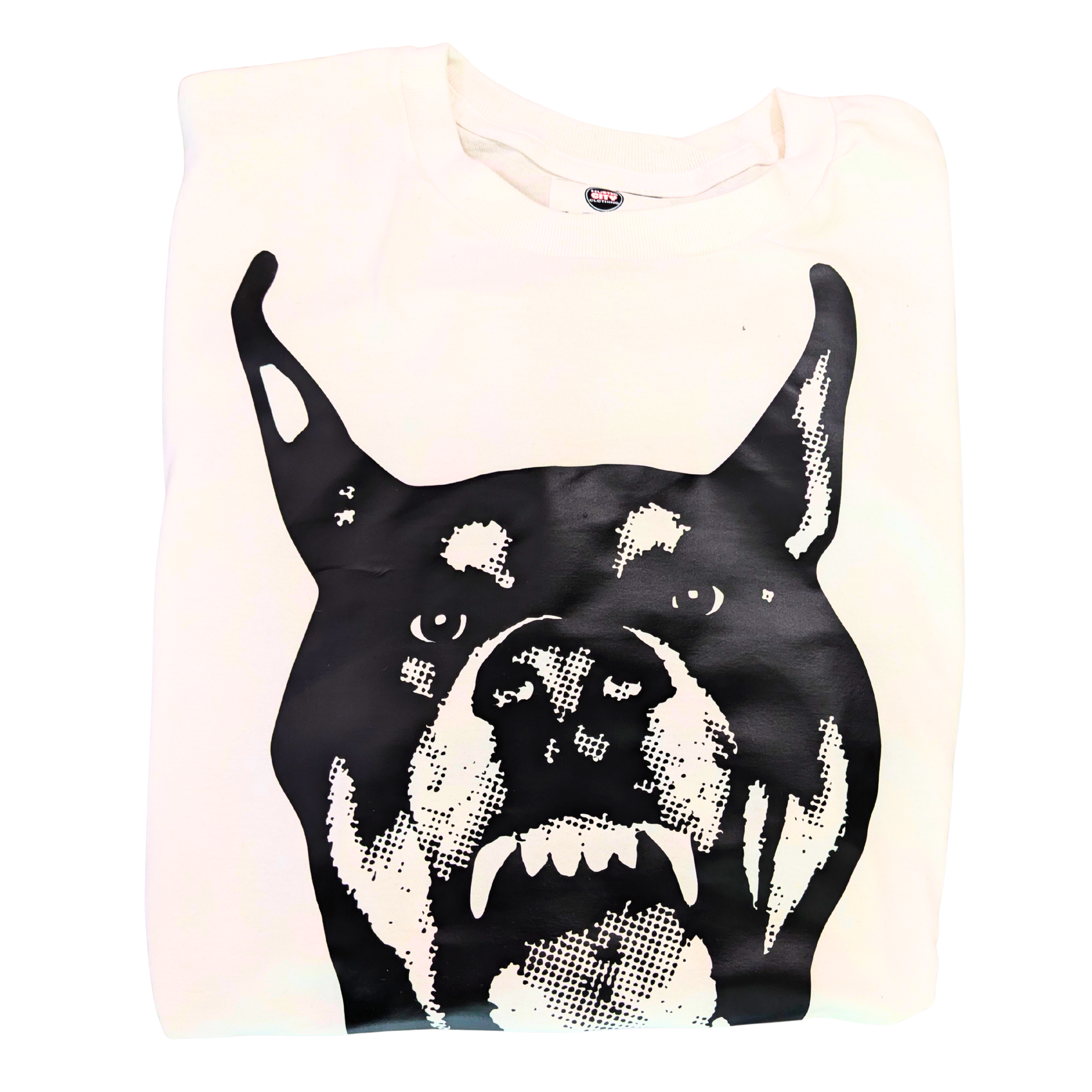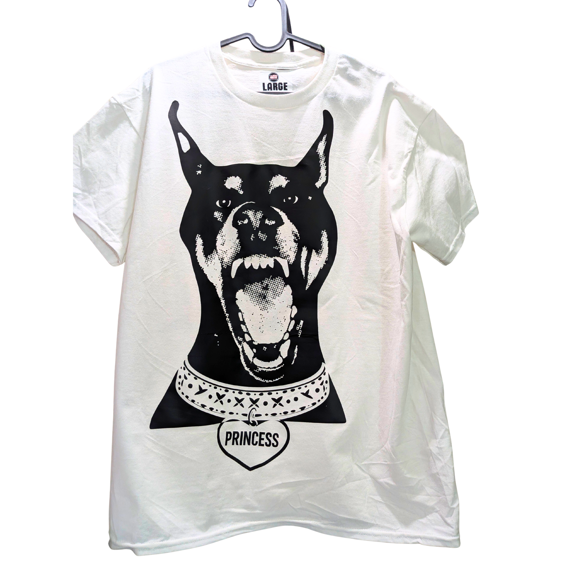 Pound Princess is loud, confrontational, and cute on purpose. A massive Doberman graphic front and center—teeth out, ears up, zero interest in being friendly. Finished with a spiked collar and a heart tag that says PRINCESS, because obviously.