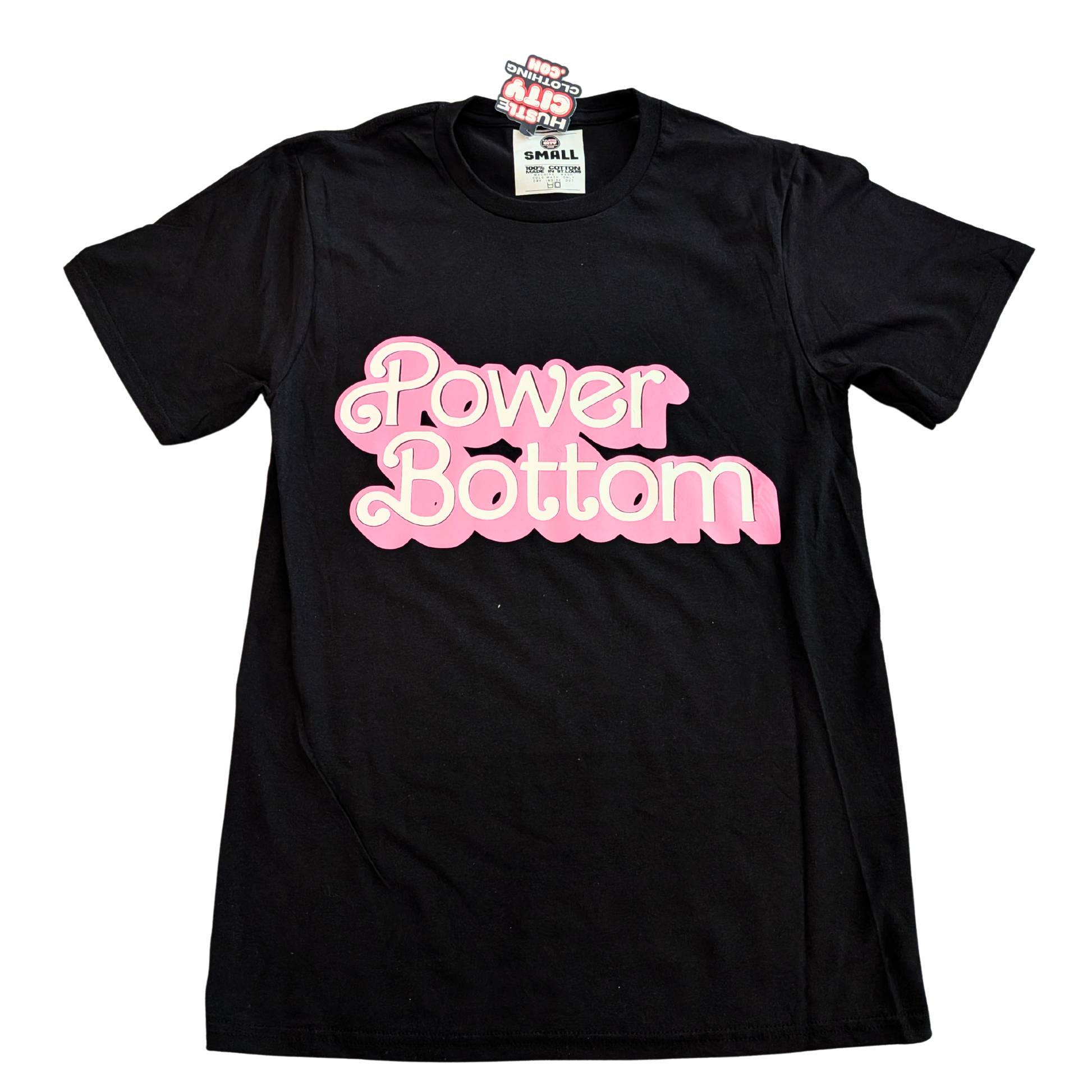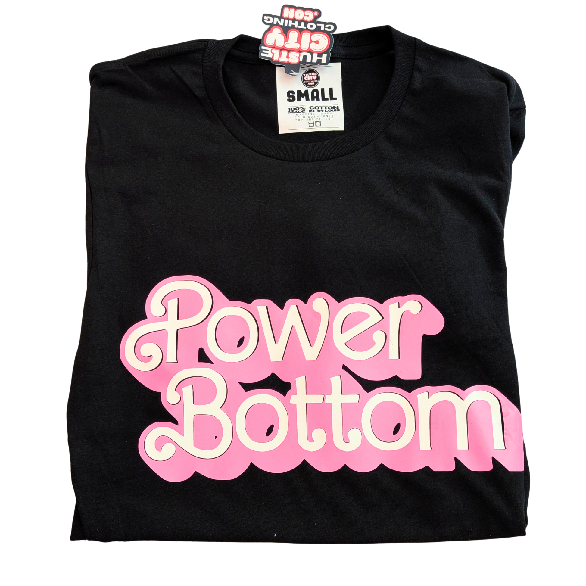 This black tee features bold pink and white lettering proudly displaying 'Power Bottom,' offering a striking design with a playful edge. Made with soft, breathable fabric, it ensures both comfort and durability for everyday wear. Its minimalist yet impactful style makes it a versatile addition to any casual wardrobe.