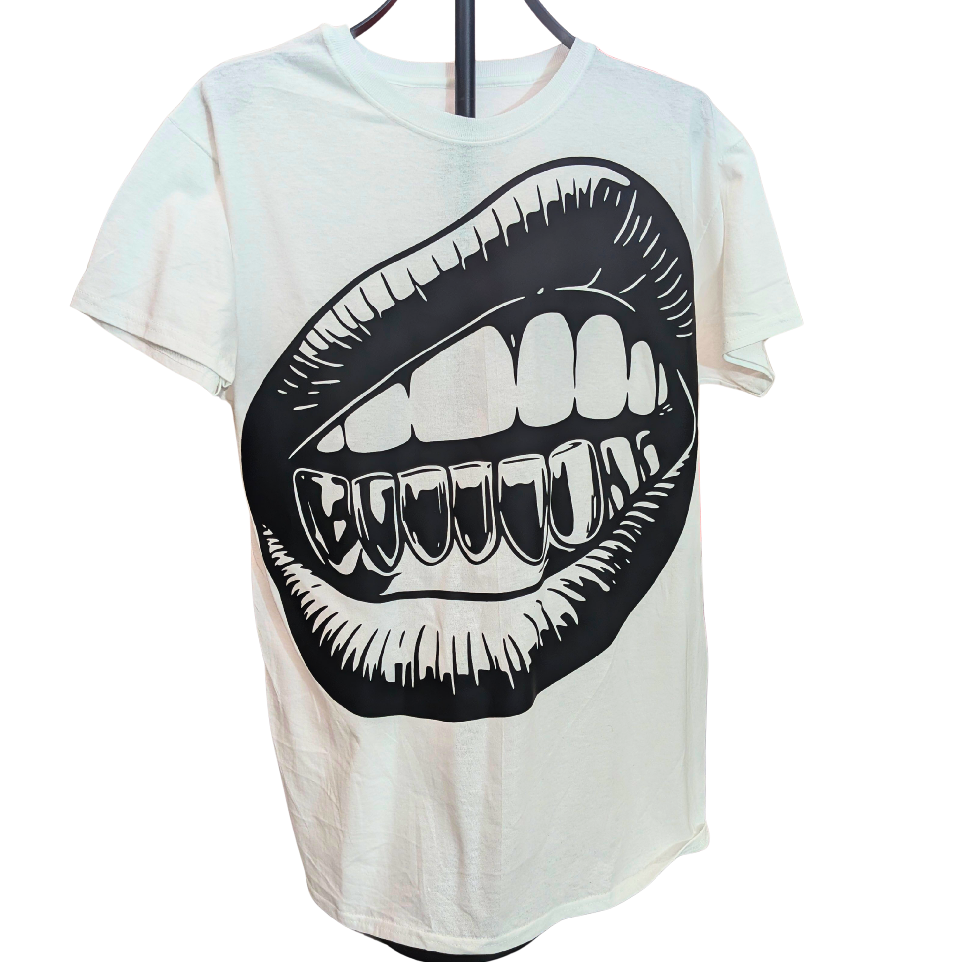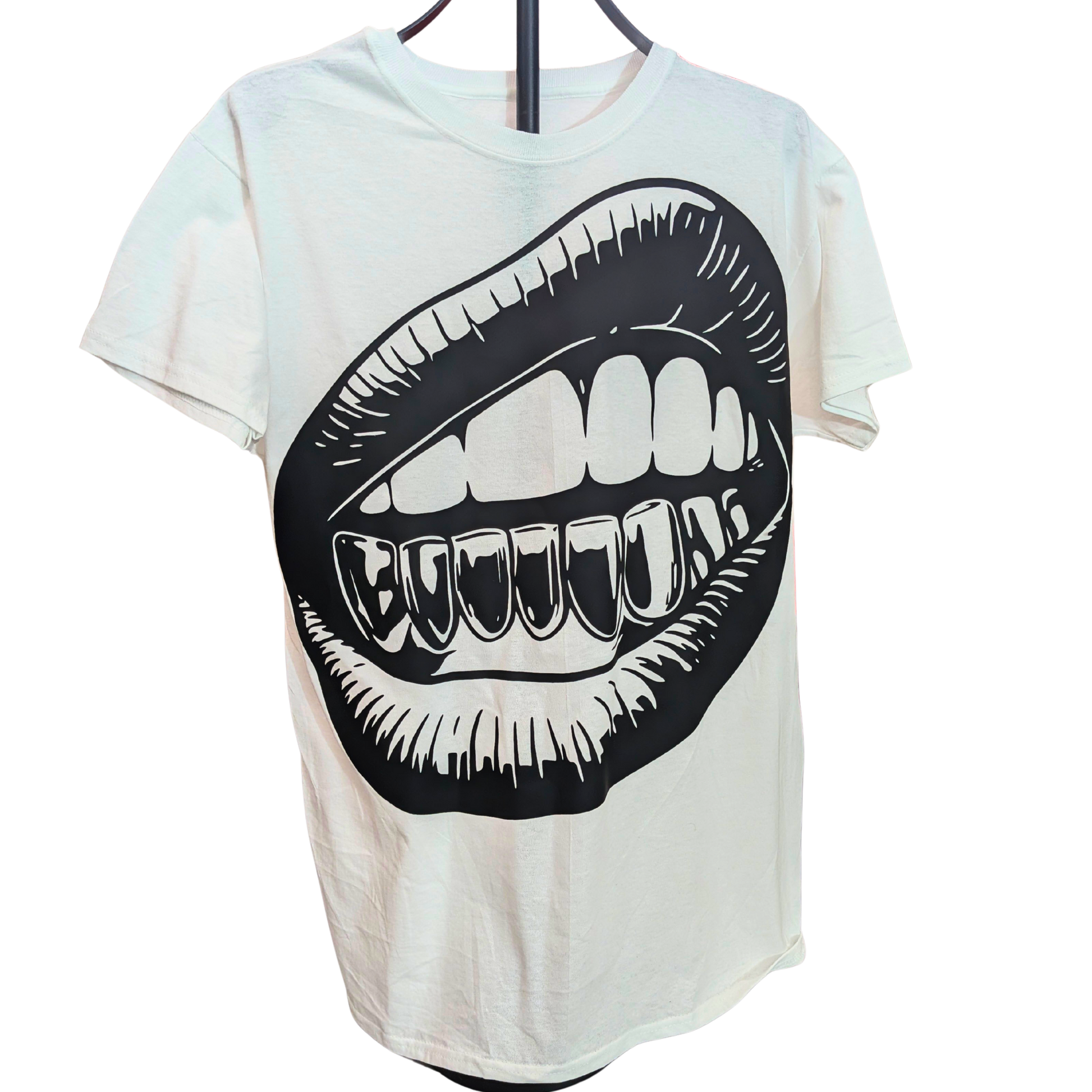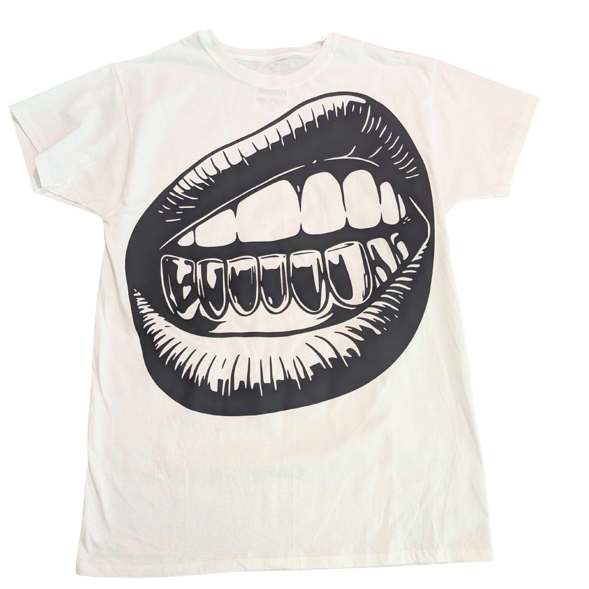 This design is built around a deliberately oversized mouth graphic that takes up real space and makes itself known immediately. The print is big on purpose. Front-and-center, no clever misdirection, no pretending it’s background texture. You don’t ease into this shirt — you commit to it.