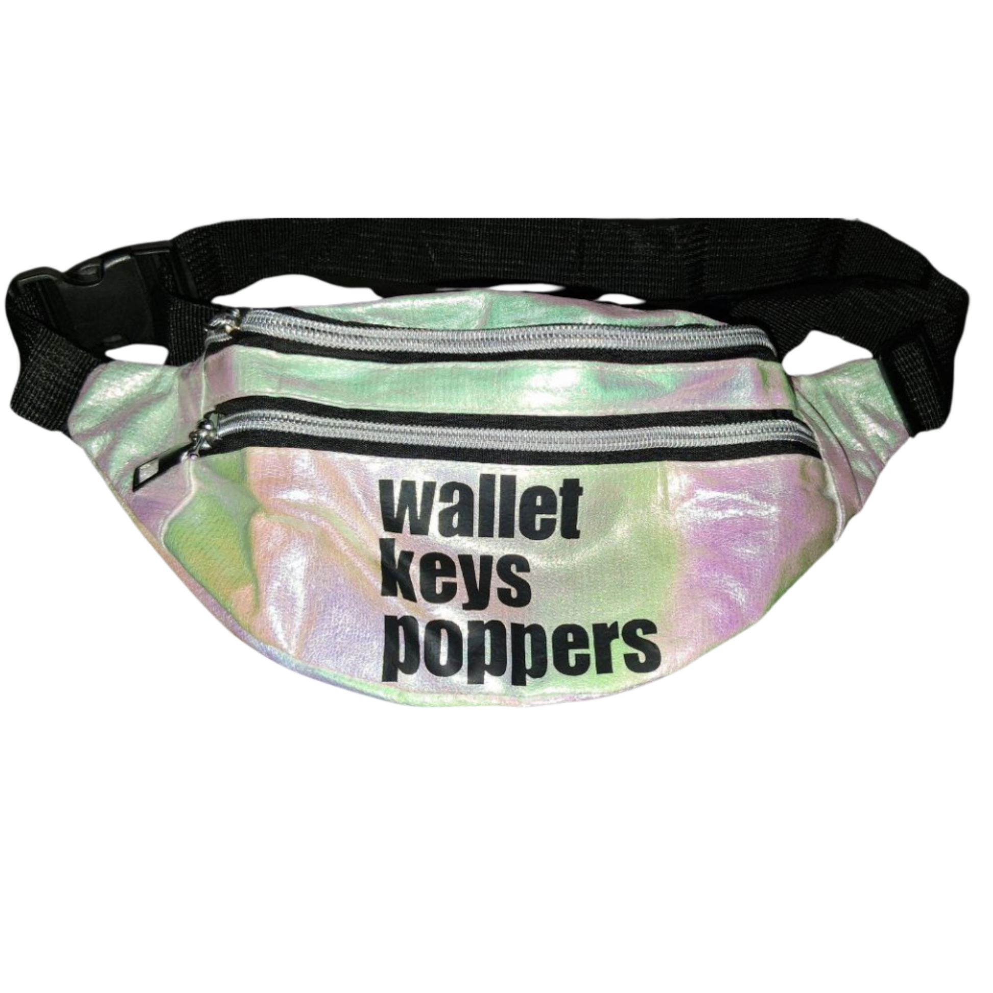 The Wallet Keys Poppers Fanny Pack / Crossbody offers hands-free convenience with secure zipper pockets and an adjustable strap for all-day comfort. Perfect for raves or pride events, it’s a practical and stylish accessory for everyone.